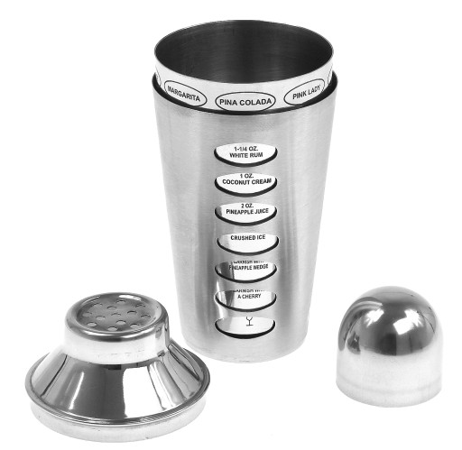 Shaker składa się z trzech elementów: pojemnika, sitka do odcedzania lodu i przykrywki.