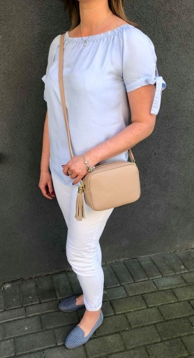 - Skórzany pasek z możliwością regulacji długości do 120 cm oraz całkowitego odpięcia, dzięki czemu torebkę można nosić jako elegancką kopertówkę.