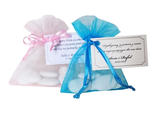 Przykładowe zastosowanie woreczków (rzeczywiste zdjęcia, bileciki do kupienia na innej aukcji - również z personalizacją)