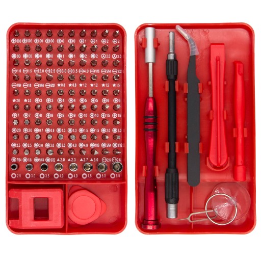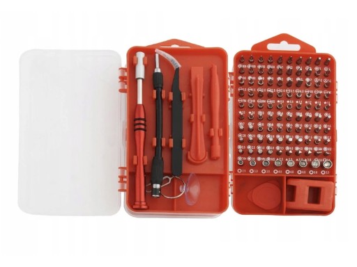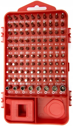 - Zestaw zawiera: 1x uchwyt, 1x przedłużacz, 1x krótki pręt, 1x pinceta, 1x magnetyzer, 1x przyssawka, 2x podważacz, 1x szpilka, 1x trójkątny otwieracz do obudów, 8x bity gniazda, 90x bity do śrubokręta