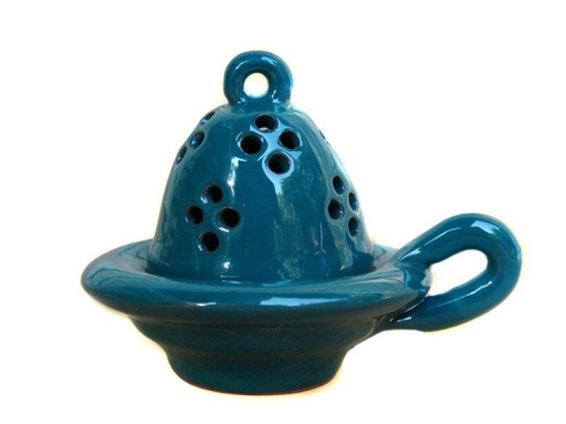 Gliniana kadzielniczka pokryta morsko-zielona glazurą. Wypalona została w piecu, dzięki czemu jest odporna na temperaturę rozgrzanego węgielka. W przeciwieństwie do kadzielnic metalowych, kadzielnica ceramiczna nie rozgrzewa się w tak szybkim tempie, dzięki czemu można ją bezpiecznie przenosić. W komplecie z drewnianą podstawką, w celu lepszej izolacji termicznej od podłoża.