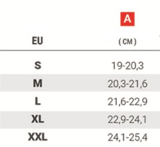 A: OBWÓD DŁONI - Zmierz obwód dłoni tak, aby lekko napięta taśma przechodziła przez kostki w ich najszerszym punkcie pomijając kciuk