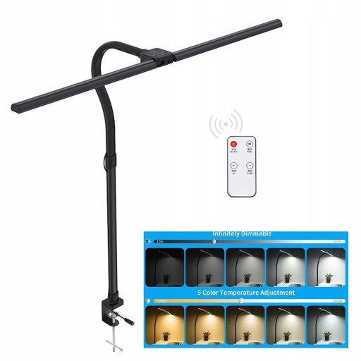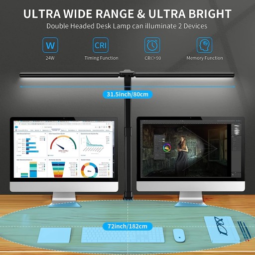 Lampa biurkowa o mocy 24W z ultra szeroką 80cm listwą świetlną może w pełni oświetlić całe biurko. Lampa biurkowa posiada podwójną głowicę. Maksymalna wysokość robocza wynosi około 76 cm, co jest odpowiednie dla 32-calowego monitora.Wysokie i duże lampy biurkowe z zaciskiem dla dużego stołu warsztatowego, stołu do rysowania, pulpitu architekta, szycia, rzemiosła, malowania, czytania lub używania jako światła monitora wieloekranowego w domu lub biurze.