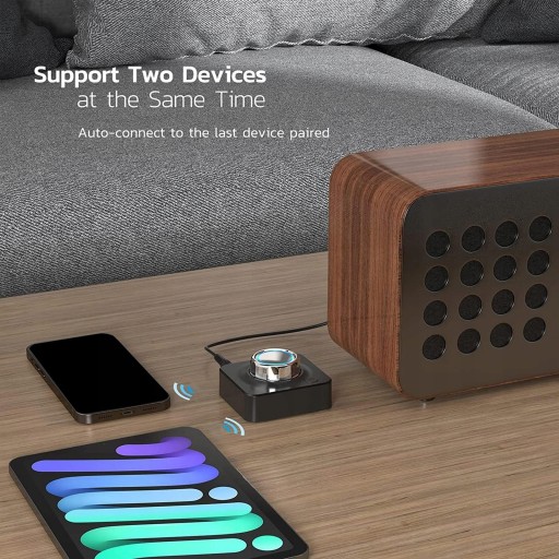 Połączenie dwóch urządzeń: sparuj smartfon i tablet w tym samym czasie i przesyłaj muzykę przez dowolny system stereo, który OBSŁUGUJE standardowe gniazda 3,5 mm lub RCA Połącz jednocześnie dwa urządzenia Bluetooth, aby słuchać muzyki, wykonywać połączenia itp