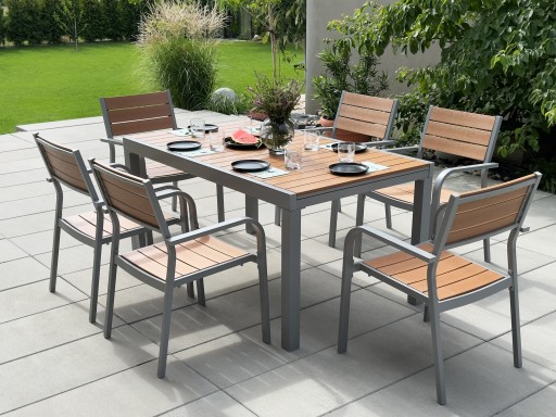 Prostokątny stół ogrodowy z desek kompozytowych WPC i aluminium.