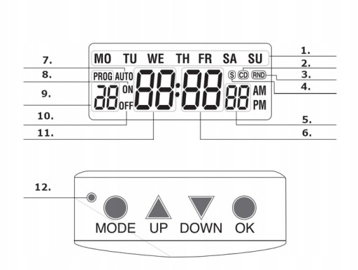 - Priorytet funkcji został ustalony w następujący sposób: funkcja Countdown, funkcja losowa, funkcja PROG ON/OFF.