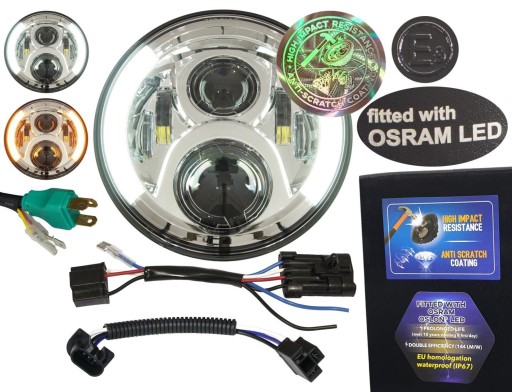 - w skład wchodzą: 1 lampa z LED-ami firmy OSRAM (z serii premium OSLON SSL), wtyczka H4, adapter H4-H13, adapter Harley Touring (2014-2021), 2 dodatkowe kable do montażu DRL