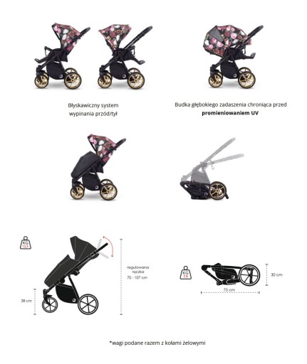 коляска, черно-золотая, спереди и сзади, розовая, светлая DEPORTE, до 22 кг