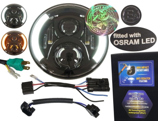 - w skład wchodzą: 1 lampa z LED-ami firmy OSRAM (z serii premium OSLON SSL), wtyczka H4, adapter H4-H13, adapter Harley Touring (2014-2021), 2 dodatkowe kable do montażu DRL