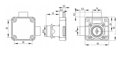 Zamek meblowy kwadratowy lewy fi19x22 z podwójnym ryglem.