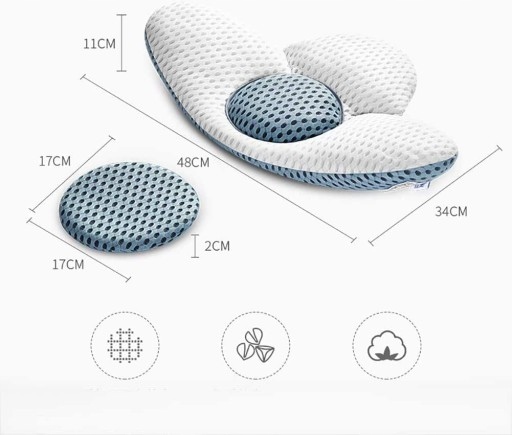 Materiał i rozmiar: siateczkowy rdzeń: bawełna gryczana perła. Rączka jest gładka i delikatna, doskonała oddychalność. Wyściółka w talii: 48 x 34 x 6,5 cm, poduszka do podnoszenia: 17 x 17 x 2 cm. Dzięki poduszce na wysokość można regulować wysokość swobodnie.