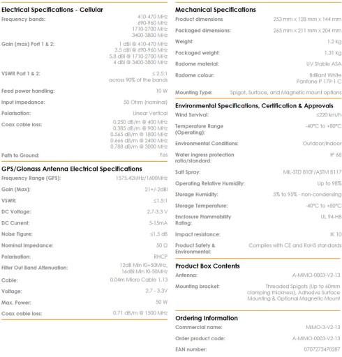 Wysokowydajna wieloczęstotliwościowa antena MIMO-3-13 3w1, zapewniająca dwie anteny komórkowe i jedną GPS / GLONASS. Dwukomórkowe anteny MIMO (dla 2G / 3G / 4G) obejmują współczesne pasma od 690 MHz do 2700 MHz, a także nowe pojawiające się widmo LTE i 5G dla pasm CBRS 450 MHz i 3,5 GHz, które stają się popularne w różnych międzynarodowych sieciach komórkowych dla LTE. Ultraszerokopasmowa wydajność anteny pozwala na użycie jej przez różnych operatorów i różne technologie i jest gotowa na przyszłe technologie komórkowe do 3,8 GHz dla aplikacji 5G. Trzecia antena to wysokowydajny aktywny system GPS / GLONASS działający do -40 ° C. MIMO-3-13 przewyższa parametry większości konkurentów dzięki dbałości o konstrukcję tej wysokowydajnej anteny. Wzorce promieniowania wszystkich elementów promieniujących zapewniają doskonałą równowagę między wielokierunkowością, różnorodnością wzorców i dobrymi zdolnościami promieniowania na żądanej wysokości. Jest to ważne kryterium dla rynku transportowego i morskiego. dla którego antena została specjalnie zaprojektowana. Główne zastosowania to pojazdy komercyjne / przemysłowe, morskie, M2M i inne systemy IoT wykorzystujące szeroką gamę technologii radiowych, zachowując przy tym przyszłość w szerokim paśmie częstotliwości.