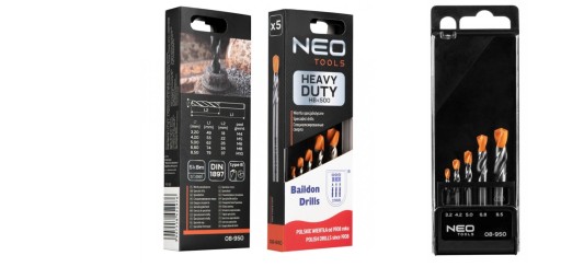 Zestaw wierteł specjalistycznych do rozwiercania zapieczonych śrub NEO (nr ref. 08-950) został stworzony we współpracy z Fabryką „Wiertła Baildon” S.A w Katowicach. Wiertła wykonane zostały z wysokowęglowej stali szybkotnącej SK8m o dużej zawartości molibdenu, niklu i kobaltu. Dedykowane do rozwiercania zapieczonych śrub, jak również do wielu zastosowań podczas obróbki bardzo wymagających materiałów (HB do 500), z zakresem średnic 3.2, 4.2, 5.0, 6.8, 8.5 mm, pod gwint M4 do M10. Dzięki zastosowaniu średnic dedykowanych pod rozmiary gwintu istnieje możliwość ponownego gwintowania rozwierconego otworu. Z uwagi na problemy z rozwiercaniem w trudno dostępnych miejscach, wiertła zostały wykonane z krótszą długością roboczą i całkowitą przy zachowaniu tolerancji średnicy. Wykonane z zaostrzeniem 135 st., z korekcją ostrza typu „B”, której zaletą jest niewrażliwość na uderzenia, jednostronne obciążenie i siły boczne. Wiertła posiadają cylindryczny typ uchwytu wiertarskiego. Wielokrotnie testowane w NEO Garage, tak aby spełnić oczekiwania profesjonalistów i miłośników branży motoryzacyjnej.