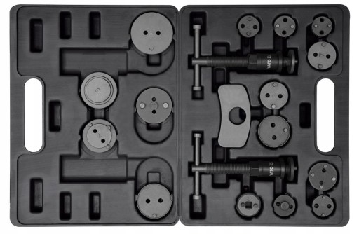 Profesjonalny zestaw przeznaczony do demontażu tłoczków hamulcowych. Przyrząd składa się z dwóch prasek śrubowych - prawoskrętnej i lewoskrętnej oraz zestawu talerzyków umożliwiających wymianę tłoczków w szerokiej gamie samochodów.