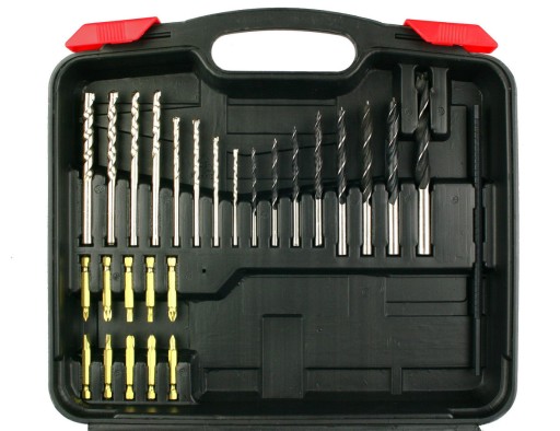 Komplet 26 sztuk różnych akcesoriów (końcówki wkretarskie, wiertła do stali, wiertła do drewna oraz widiowe wiertła do betonu i cegły) - komplet zawiera: