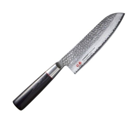 Santoku to japoński brat zachodniego noża szefa kuchni. Jego nazwę tłumaczy się jako „trzy zalety”, ewentualnie „trzy cnoty”. Nie bez powodu – nóż ten, z wyglądu stanowiący skrzyżowanie typowego noża szefa kuchni z tasakiem, jest wielofunkcyjny. Sprawdzi się podczas krojenia mięsa, ryb i warzyw.
