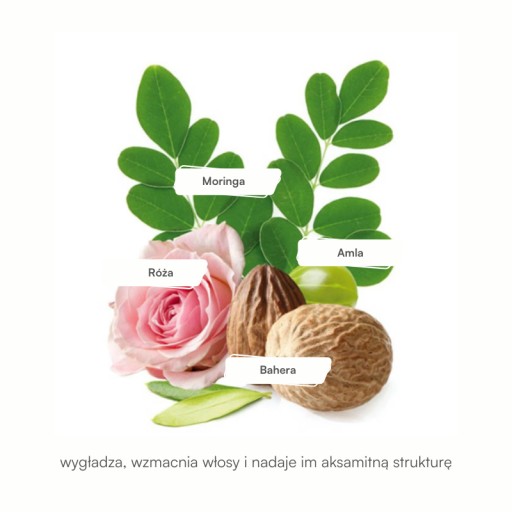 - Moringa – superfood niezwykle bogaty w składniki odżywcze. Dostarcza włosom oraz skórze głowy niezbędnych mikroelementów i pobudza ich wzrost.