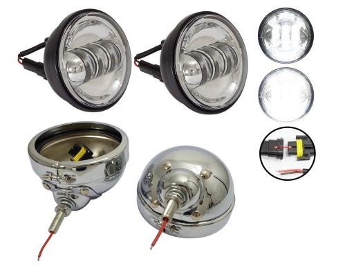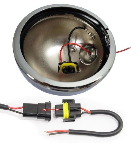 - Każda klosz posiada kabel do masy połączony z wtyczką, wodoodporną wtyczkę (kompatybilną z wtyczkami lamp LED 4,5-calowych) oraz wyprowadzony przez śrubę kabel, który należy połączyć z instalacją w motocyklu lub z wyłącznikiem lamp.