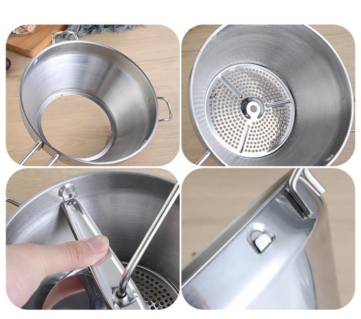 - Jest idealny do owoców, sosów, puree, zup i żywność dla niemowląt. Możesz użyć tego młynka do żywności ze stali nierdzewnej do oddzielania skórek, włókien i nasion od puree