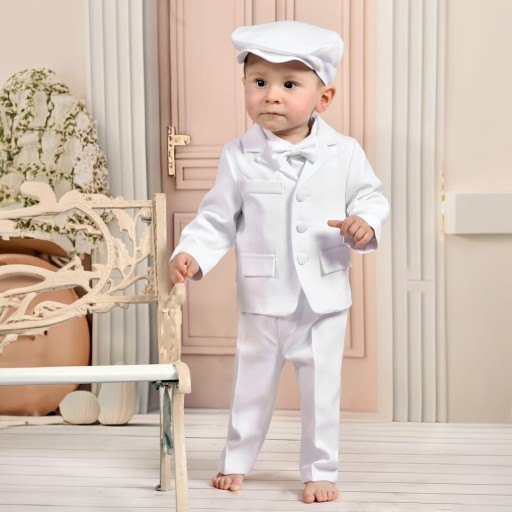 Stylowy kompletny garnitur dziecięcy, idealny na uroczystości takie jak Chrzest Święty. Ten elegancki zestaw w kolorze białym jest estetycznie wykonany i gwarantuje wygodę przez całą uroczystość. Składa się z marynarki, koszulo-body, muszki, spodni oraz kaszkietu, tworząc pełen i doskonały zespół. Nasz produkt pochodzi od renomowanego polskiego producenta, który jest synonimem jakości i niezawodności. Wybierz nasz biały garnitur, aby wyglądać elegancko i z klasą podczas każdej okazji!