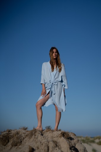 Sukienka Saguaro jest niezwykle kobieca, a zarazem praktyczna – jest nieco dłuższa, dzięki czemu nie musicie na każdym kroku myśleć o podwijającym się z tyłu materiale. Krój kimona gwarantuje, że sukienka dobrze leży na każdym rodzaju sylwetki, a ściągnięcie w talii podkreśla kobiece kształty i optycznie wyszczupla figurę. Błękitny pastelowy kolor sukienki uwydatnia delikatną opaleniznę i nadaje subtelności. Sukienka świetnie wygląda w towarzystwie kapelusza i odkrytych butów. Saguaro jest idealna na wakacje w ciepłych krajach i upalne dni w mieście – została uszyta z muślinu, który zabezpiecza przed przegrzaniem, chroni przed słońcem i minimalizuje pocenie.