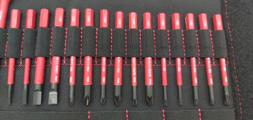 Zestaw narzędzi obejmuje ergonomicznie ukształtowany uchwyt wkrętaka dynamometrycznego ze zintegrowaną skalą numeryczną, 15 bitów typu slimBit, uchwyt na bity oraz narzędzie nastawcze. Wszystkie te komponenty są rozmieszczone w sposób praktyczny i przejrzysty w wysokiej jakości torbie odpornej na zużycie.