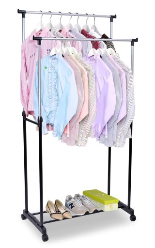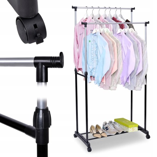 Na tej aukcji oferujemy praktyczny i wytrzymały wieszak garderobiany na kółkach. Wieszak sprawdzi się w każdym domu i w biurze, w którym brakuje miejsca do powieszenia odzieży. Nasz produkt został wyposażony w podwójny drążek, który pomieści dużo odzieży. Wysokość wieszaka można regulować w zależności od potrzeb. Dodatkowym atutem wieszaka jest wytrzymała i zaskakująco pojemna półka na buty, oraz nakładki na końce drążka uniemożliwiające zsunięcie się odzieży. Montaż wieszaka jest niezwykle prosty i nie wymaga użycia narzędzi. Czarny kolor wieszaka sprawi, że doskonale wpisze się w każdy styl wnętrza, w szczególności glamour i loft.