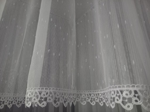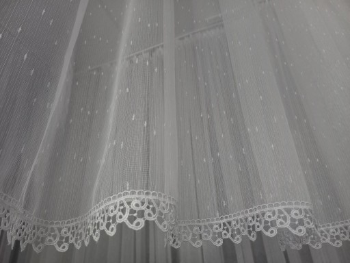 Przedmiotem sprzedaży jest śliczna, przejrzysta , przepuszczająca dużo światła firana z wysokiej jakości markizety- deszczyk wykończona na dole delikatną 4cm gipiurą - NOWOŚĆ!