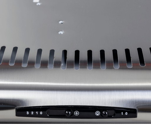 Sterowanie okapem odbywa się mechanicznie, za pomocą przycisków. Wystarczy jedno dotknięcie placem, aby ustawić jeden z trzech poziomów mocy turbin, czy włączyć oświetlenie.