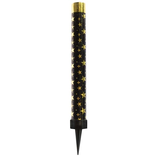 Fontanna w kolorze czarnym z nadrukiem złotych gwiazdek. Bardzo efektowna dekoracja idealna na urodziny, wesela jak i inne okazje. Po odpaleniu wyrzuca pięknie wyglądające złote iskierki. Fontanna jest bezpieczna w użyciu. Posiada szpic umożliwiający bezpieczne osadzenie i utrzymanie się w pionie.