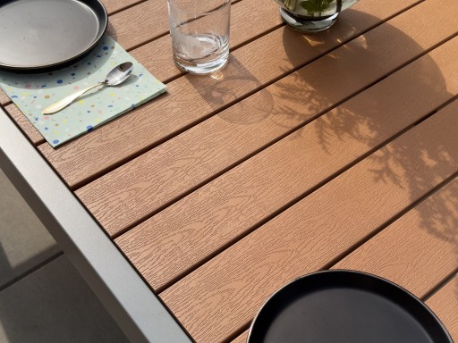 Prostokątny stół ogrodowy z desek kompozytowych WPC i aluminium.