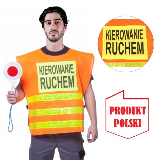 ✅ napis "KIEROWANIE RUCHEM" umieszczony jest z przodu i na plecach na żółtym fluorescencyjnym tle