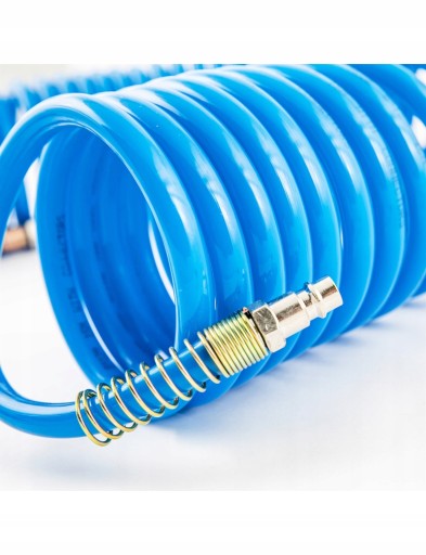 Elastyczny wąż spiralny do sprężonego powietrza z przedłużonymi odcinkami prostymi . Wąż zakończony standardowymi szybkozłączami , które pasują do wszystkich narzędzi i urządzeń pneumatycznych.