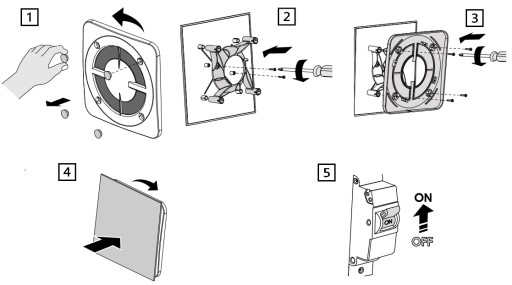 1️⃣ Zdjąć panel przedni z wentylatora, obracając go w kierunku przeciwnym do ruchu wskazówek zegara. Wyjąć zaślepki.