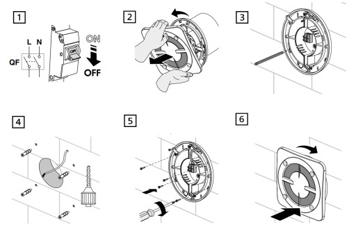 5️⃣ Zamontować wentylator za pomocą wkrętów. Podłączyć wentylator do sieci zasilającej zgodnie ze schematem połączeń.