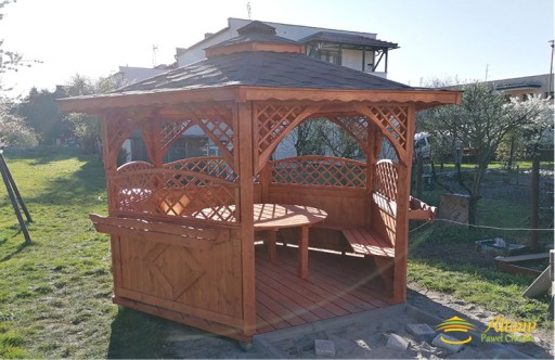 Altana o średnicy 4 metry, kryta gontem bitumicznym, na wyposażeniu drewniany stół, 5 ławek przymocowanych na stałe, 5 kratek półokrągłych, podłoga i pomalowanie.