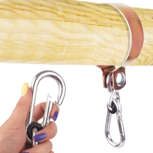 Mocowanie idealnie nadaje się do huśtawek czy hamaków. Przeznaczone jest do mocowania huśtawki czy hamaka na belce drewnianej lub rurce. Obejma posiada otwory do przykręcania oraz karabińczyk. Dzięki teflonowej wkładce huśtanie jest ciche i przyjemne.