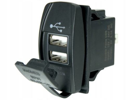 Gniazdo ładowania USB podwójne. Wykonane z tworzywa sztucznego. Dzięki zastosowaniu elastycznej klapki gniazdo jest bryzgoszczelne i może być stosowane na zewnątrz