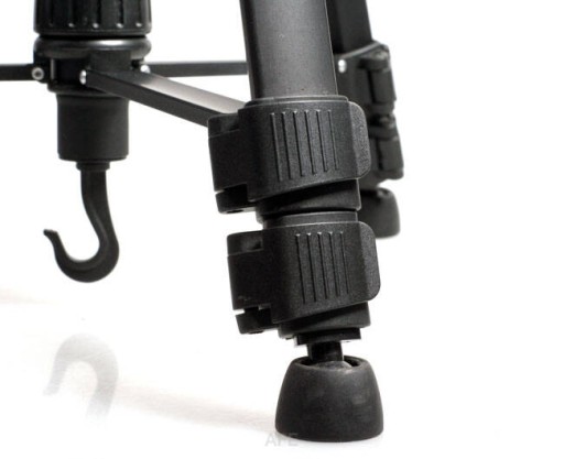 ✔ Solidna rękojeść nadaje większą mobilność dla statywu. Zamontowany na stałe hak pozwala na zawieszenie dodatkowego balastu i zwiększenie ciężkości zestawu (ważne przy montowaniu bardzo ciężkich kamer video). Widoczny nad hakiem obrotowy element pozwala na zablokowanie rozstawu statywu w dowolnym punkcie (dzięki czemu wysokość statywu można powiększyć dodatkowo o około 10 cm).