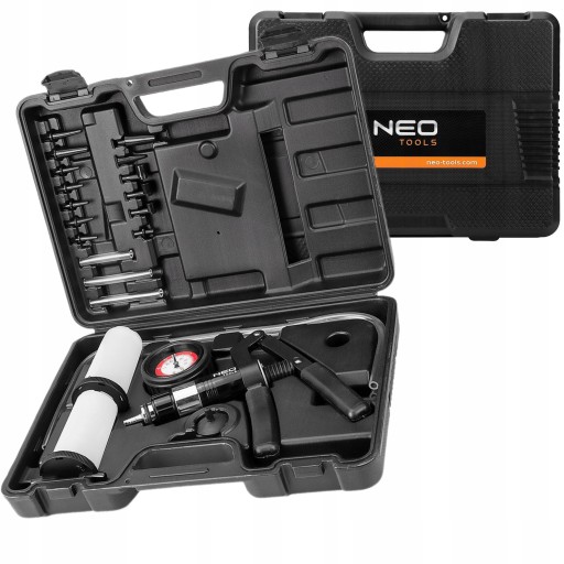 Zestaw do układów cieśnienia/podciśnienia 11-267, NEO TOOLS przeznaczony do odpowietrzania układów hamulcowych oraz sprzęgła i układu wspomagania kierownicy. Zestaw sprawdzi się także do sprawdzania czujników podciśnienia, zaworu recyrkulacji spalin, przepustnicy, regulatora ciśnienia paliwa, modulatora ciśnienia w automatycznych skrzyniach biegów. W zestawie zbiorniki, przewody i adaptery do odpowietrzania układów hamulcowych i sprzęgłowych. Manometr o zakresie pracy od -1 do 3 barów. Zestaw znajduje się w walizce.