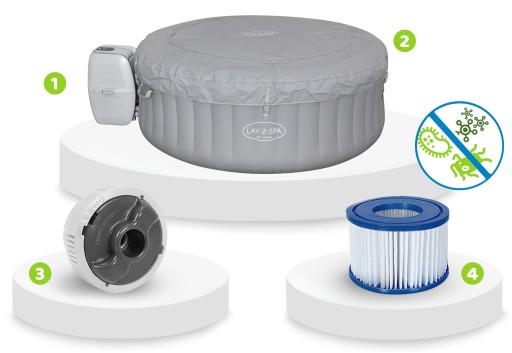 - jacuzzi, - pompa z zintegrowanym podgrzewaczem - elektroniczny panel, - pokrywa górna z dodatkową komorą termiczno - powietrzną zapobiegającą wychładzaniu wody, - pływający podajnik środków chemicznych, - filtr VI (58323), - szczegółowa instrukcja DVD dotycząca konserwacji i konfiguracji SPA.