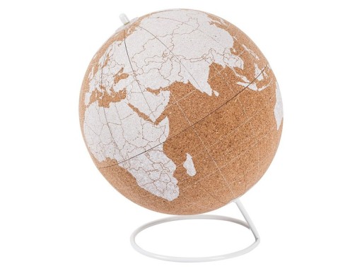 Opisywany produkt to dekoracyjny mini globus korkowy, który służy do zaznaczania celów podróży. Globus posiada nadrukowaną mapę świata z wyraźnymi granicami krajów, co ułatwia orientację na mapie i pozwala na dokładne zaznaczanie miejsc.