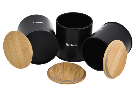 Stylowe i oryginalne pojemniki do cukru, kawy i herbaty, wykonana ze stali w kolorze czarnym matowym.