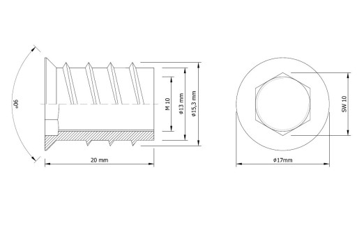 - Mufa do drewna posiada nacięcie na klucz imbusowy SW 10 MM w celu łatwiejszego wkręcenia w wywiercony otwór.