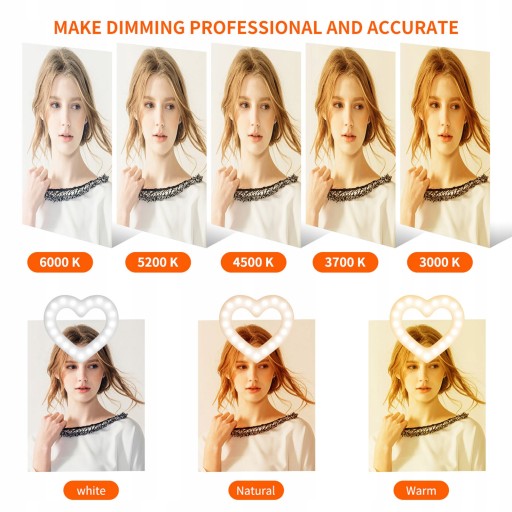 Specjalne światło wypełniające LED w kształcie serca oferuje kolorowe tryby oświetlenia RGB, różne tryby efektów RGB, 3 podstawowe tryby oświetlenia (ciepły / naturalny / zimny) i 10 poziomów regulowanej jasności.
