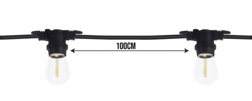 Produkt posiada 20 gniazd na żarówki E27 LED, odległość między gniazdami wynosi 100cm (całość sznura to 20m).