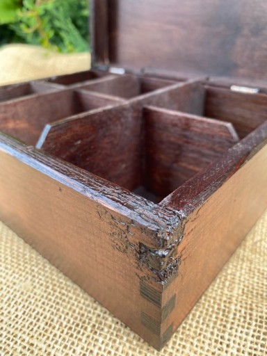 Drewniane pudełko z szybką posiada sześć przegródek na herbatę. Drewno jest wypalane prądem, opalane oraz lakierowane.