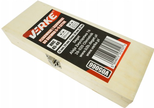Zestaw zawiera 5 flekowników i 5 sękowników o średnicach 15, 20, 25, 30, 35 mm, zapakowanych w poręczną drewnianą skrzynkę.