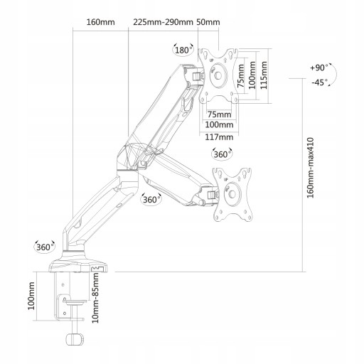 - Uchwyt na sprężynie gazowej - płynna i delikatna regulacja wysokości monitora