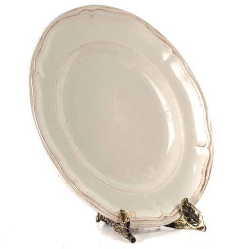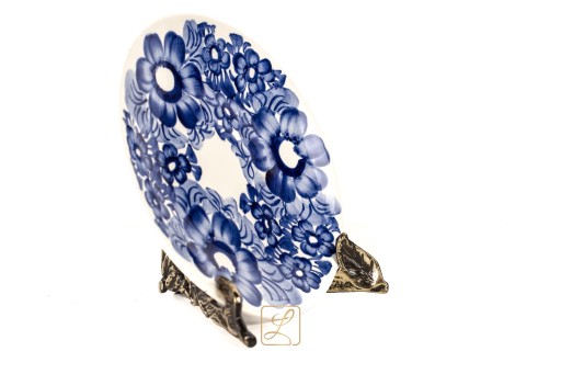 Stojak wykonany przez polskich rzemieślników z odlewu mosiężnego. Składa się z dwóch ruchomych części połączonych nitami tworzącymi zawias. Piękny ażurowy kwiecisty motyw, przepolerowany w miejscach eksponowanych, ciemniejszy w zakamarkach, lakierowany. Wielkość i kształt talerza na dobrą sprawę nie ma znaczenia. Widoczne na zdjęciach talerze: okrągły mały, okrągły duży i owalny stoją stabilnie, wystarczy jedynie odpowiednio rozszerzyć nasz stojak.